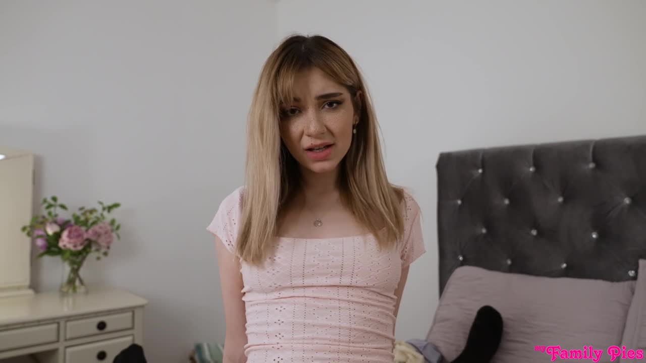 Стройная молодая блондинка с веснушками и пикантной внешностью соблазняет своего мускулистого отчима прямо в спальне. Девушка с аппетитными формами сначала страстно берёт его большой твёрдый член в рот, облизывая и смотря ему в глаза с похотливым взглядом. Затем она садится сверху и жадно скачет на его члене, громко стоная от удовольствия, пока её упругие сиськи трясутся в такт движениям. Мужчина укладывает её на спину и жёстко трахает в тугую киску, доводя до оргазма, после чего заканчивает мощным камшотом внутрь, оставляя сперму вытекать из её письки.